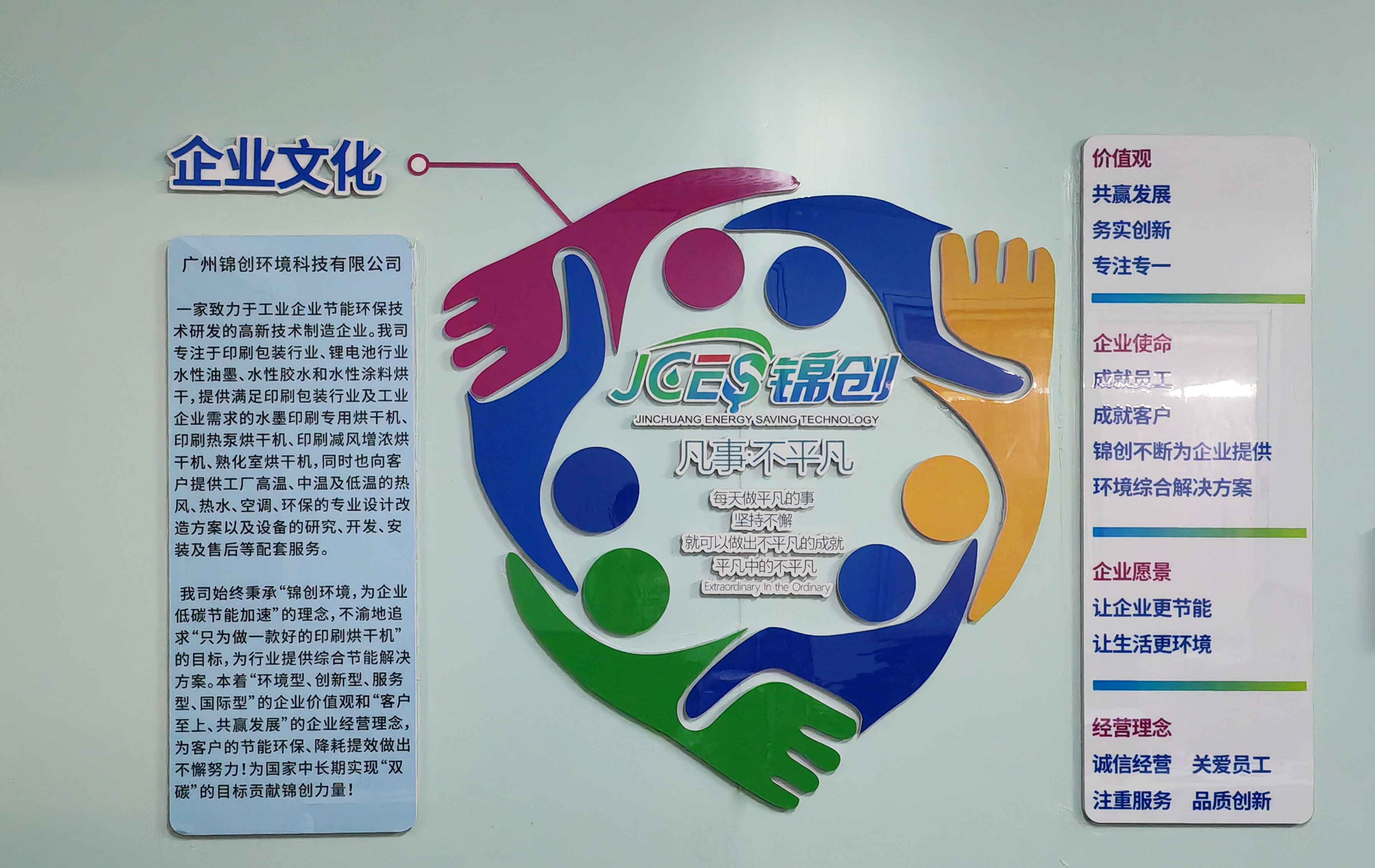 廣州錦創(chuàng)環(huán)境科技有限公司是一家坐落于羊城廣州的南沙自貿(mào)區(qū)的高新技術(shù)制造企業(yè),致力于工業(yè)企業(yè)節(jié)能環(huán)保技術(shù)研發(fā),專注于印刷包裝行業(yè)、鋰電池行業(yè)水性油墨、水性膠水和水性涂料烘干,提供水性油墨專用烘干技術(shù)、設(shè)備、環(huán)保及一體化解決方案,公司提供滿足印刷包裝行業(yè)及工業(yè)企業(yè)需求的水墨印刷專用烘干機(jī)、印刷熱泵烘干機(jī)、印刷減風(fēng)增濃烘干機(jī)、熟化室烘干機(jī),同時(shí)也向客戶提供設(shè)備和工廠之高溫、中溫及低溫的熱風(fēng)、熱水、空調(diào)、環(huán)保的專業(yè)設(shè)計(jì)改造方案并提供設(shè)備的研究、開發(fā)、安裝及售后等配套服務(wù)。